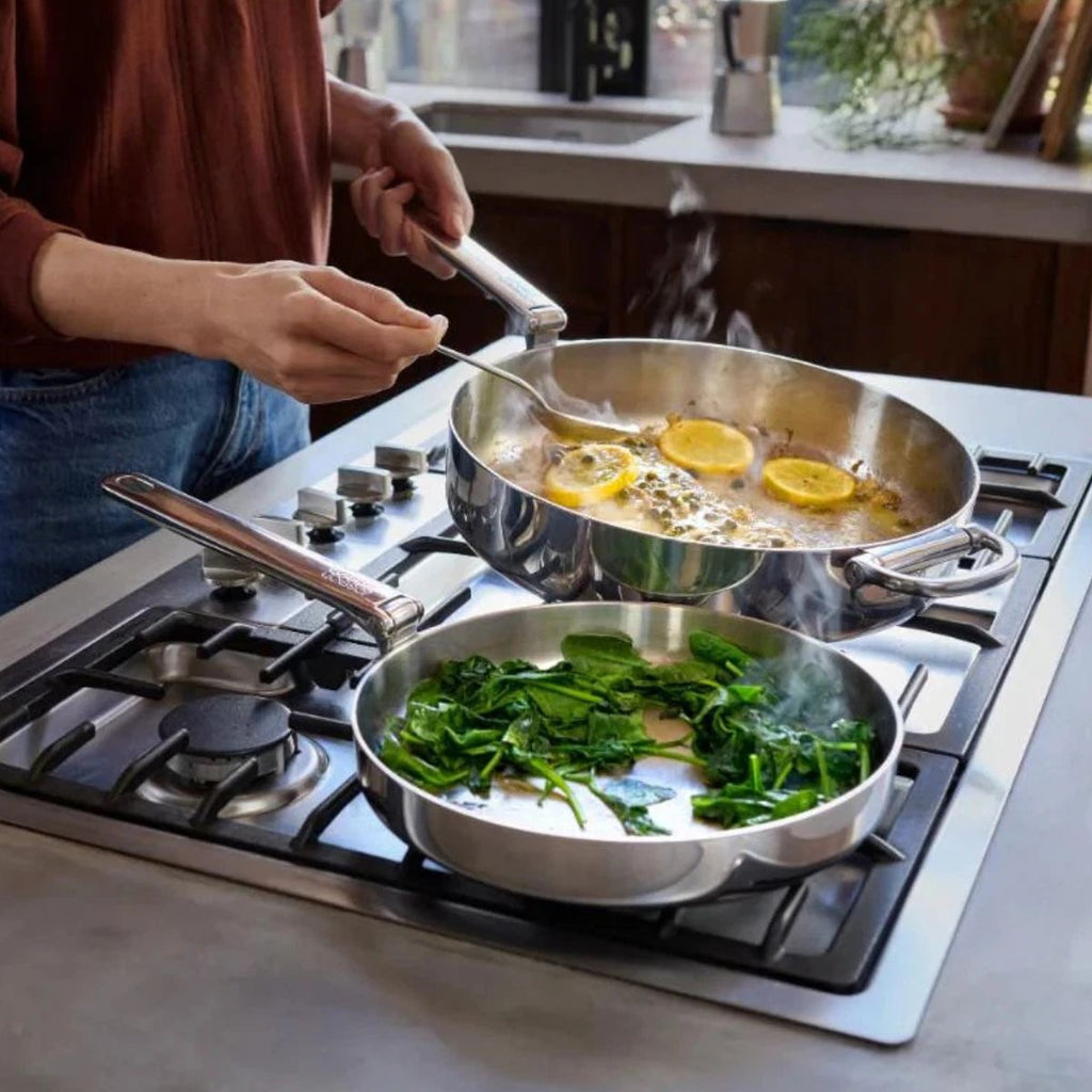 Ses parois hautes et droites, qui offrent une grande polyvalence. Avec son intérieur inox sans revêtement, c’est une poêle idéale pour frire, sauter, dorer ou marquer n'importe quel aliment. Mais son design sauté en fait une excellente casserole basse, parfaite pour préparer toutes sortes de plats en sauce, ragoûts ou plats de pâtes, avec une grande efficacité et une excellente répartition de la chaleur, grâce à sa construction en trois couches.