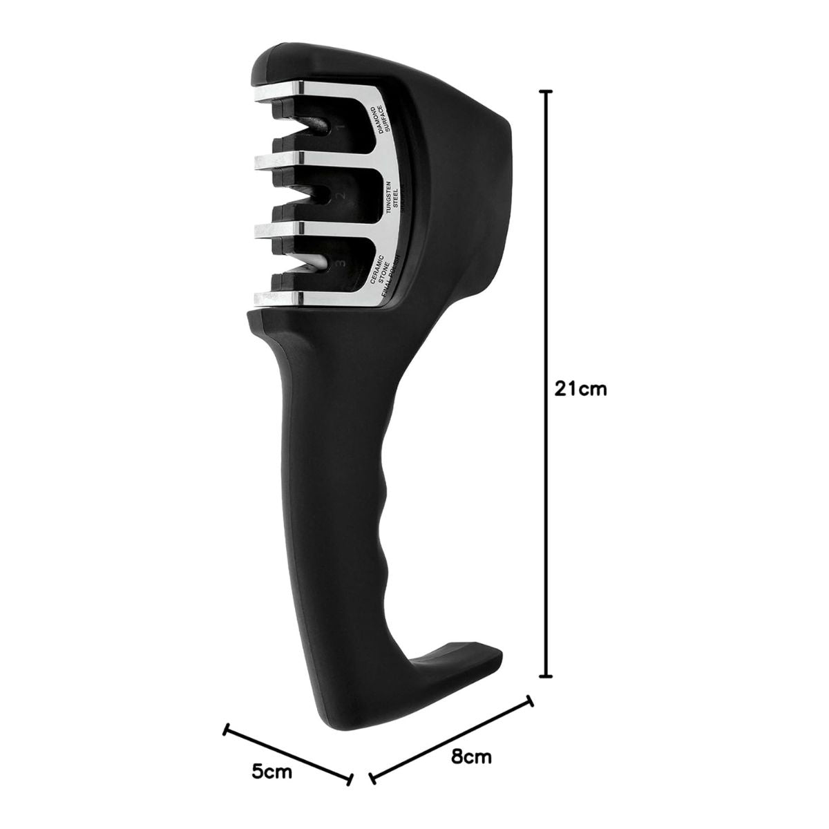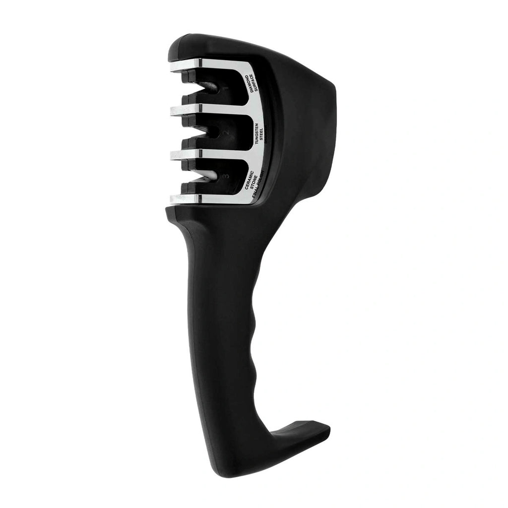 L’aiguiseur 3 en 1 permet d’obtenir des résultats professionnels grâce à ses trois étapes. La première fente est en pierre diamantée et prépare la lame à l’affûtage. Ensuite, elle passe par la fente en acier au tungstène qui restaure le tranchant et le met en forme de V.