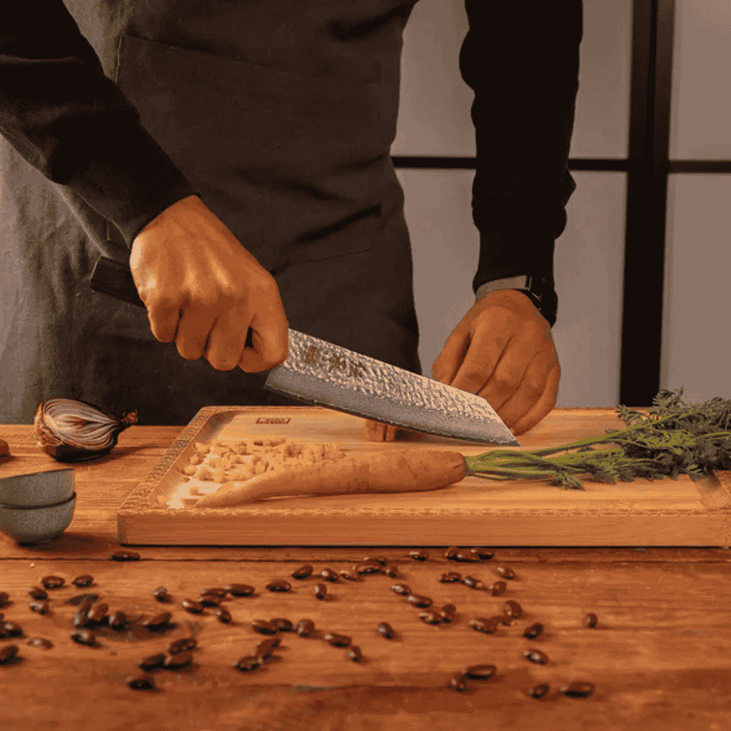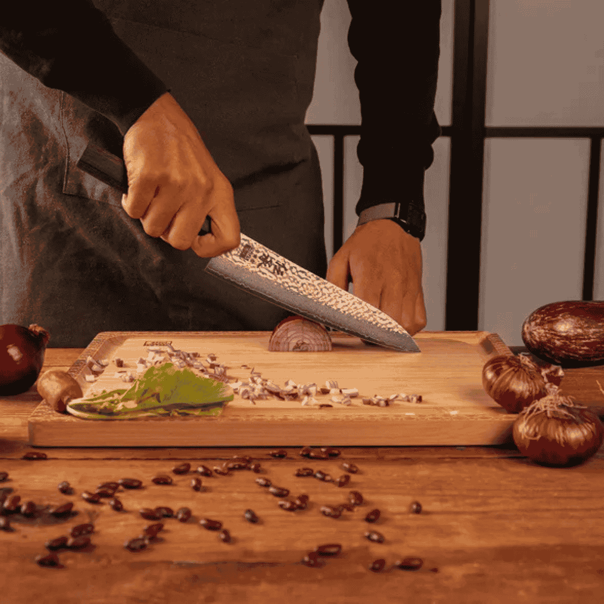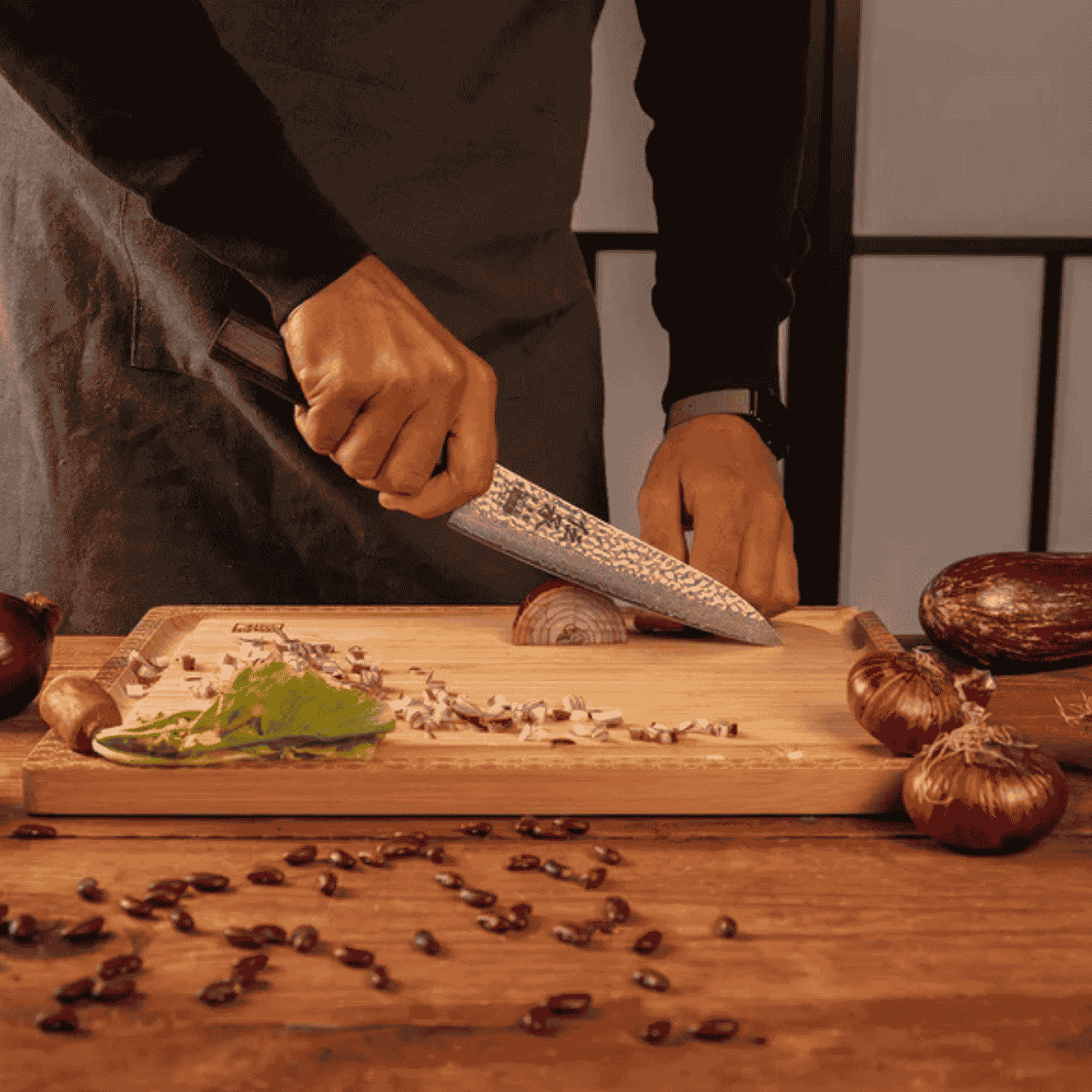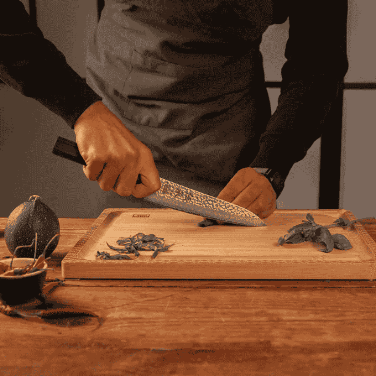 Les couteaux Densho sont le fruit d'un artisanat soigneusement préservé et transmis de génération en génération. Les lames en damassé martelé, faites à la main avec de l'acier inoxydable japonais, sont la combinaison parfaite entre beauté et précision. Chaque couteau est présenté dans un élégant coffret en bois de bambou.