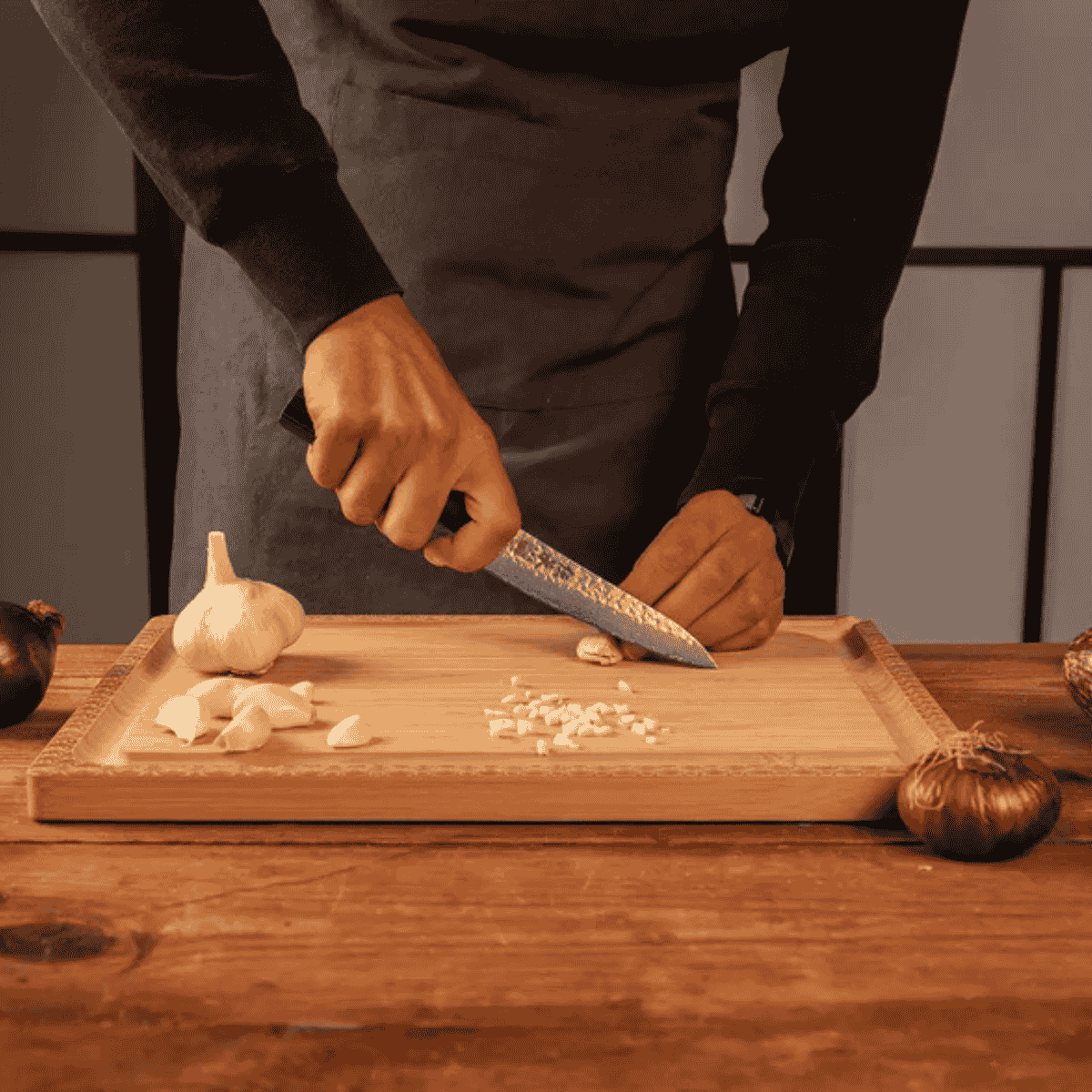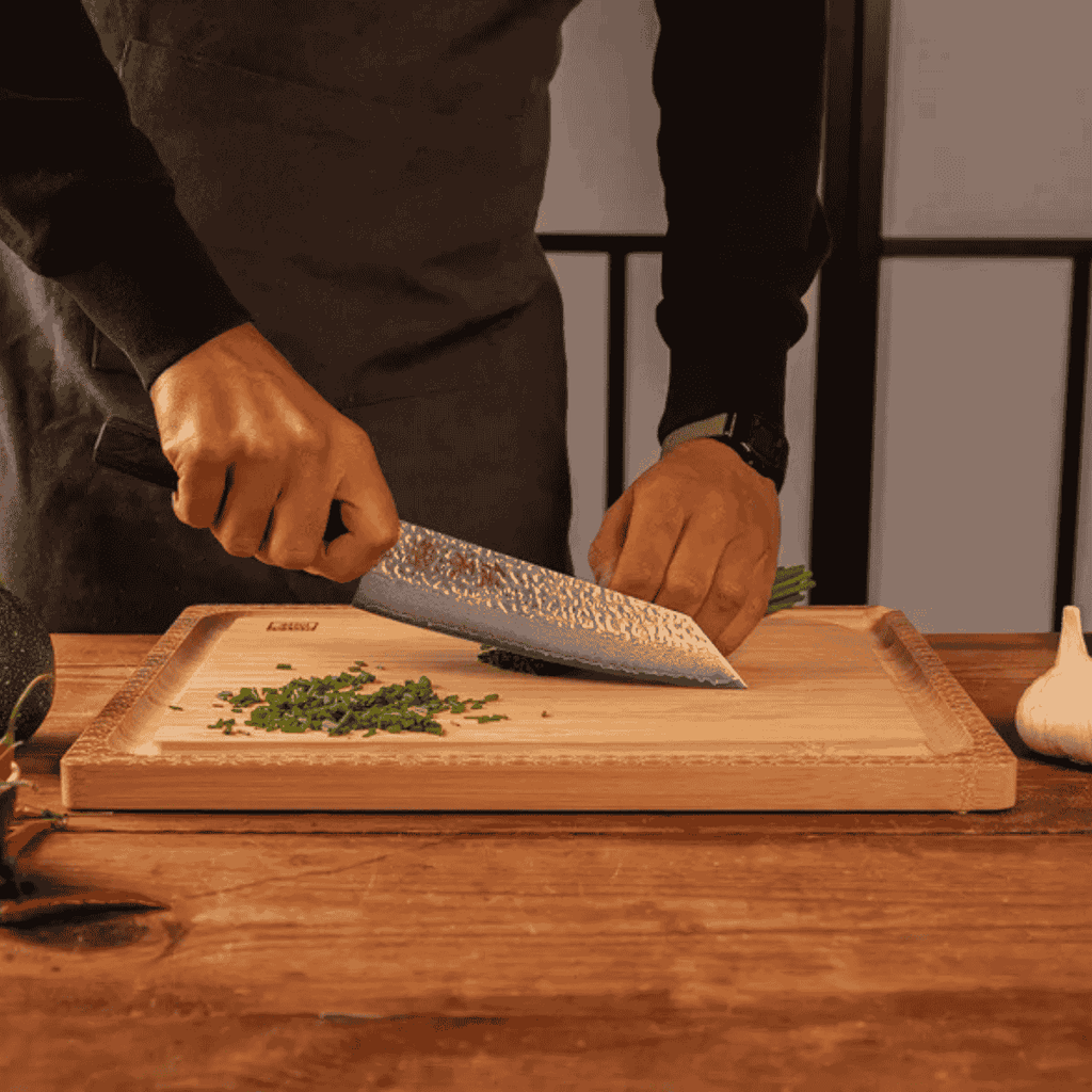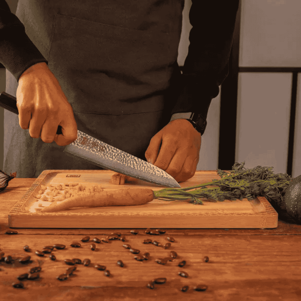 Les couteaux Densho sont le fruit d'un artisanat soigneusement préservé et transmis de génération en génération. Les lames en damassé martelé, faites à la main avec de l'acier inoxydable japonais, sont la combinaison parfaite entre beauté et précision. Chaque couteau est présenté dans un élégant coffret en bois de bambou.