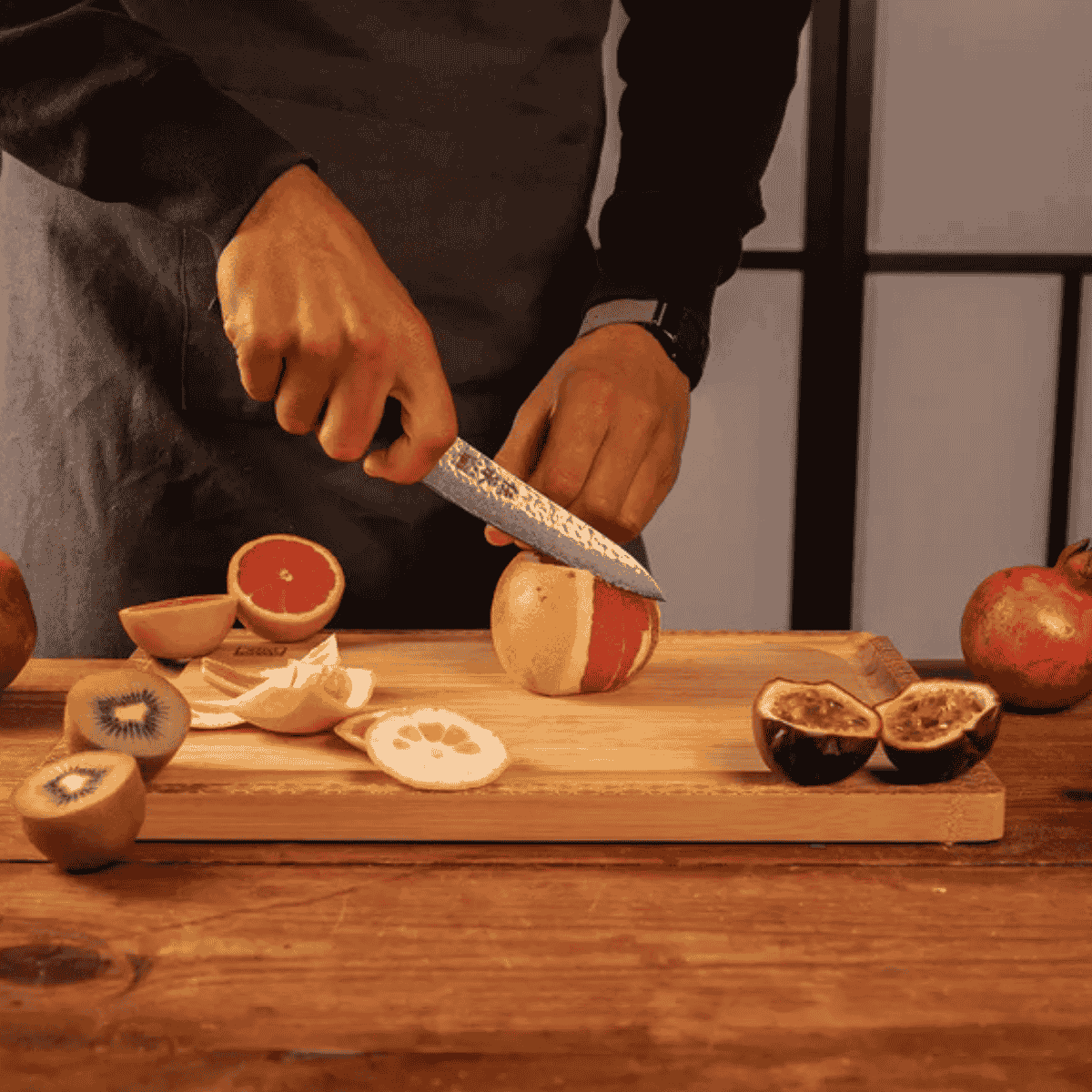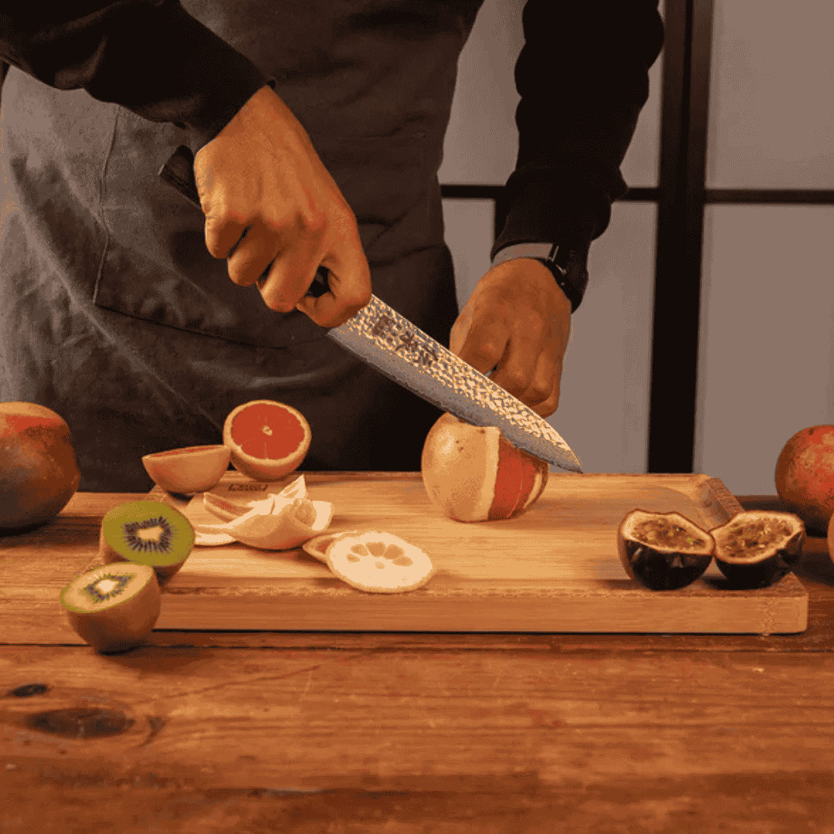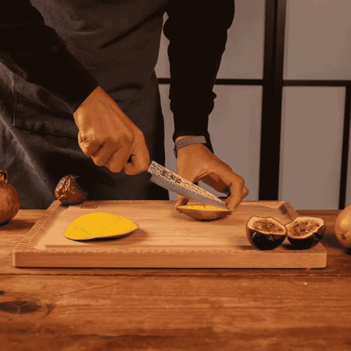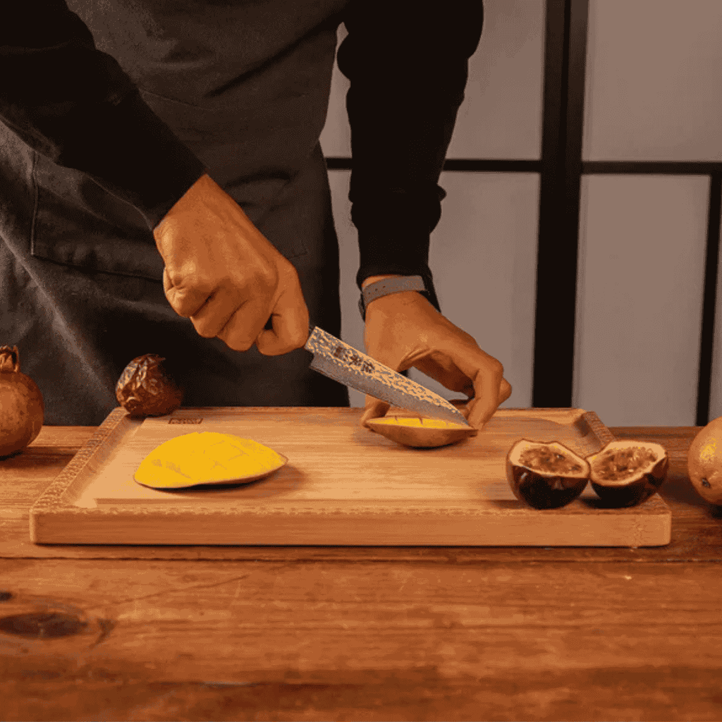 Les couteaux Densho sont le fruit d'un artisanat soigneusement préservé et transmis de génération en génération. Les lames en damassé martelé, faites à la main avec de l'acier inoxydable japonais, sont la combinaison parfaite entre beauté et précision. Chaque couteau est présenté dans un élégant coffret en bois de bambou.