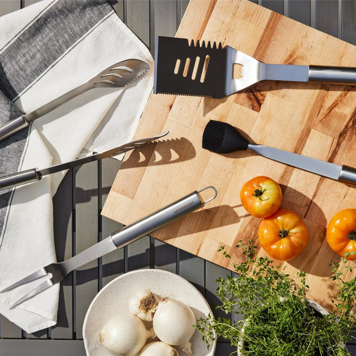 Si vous aimez les barbecues, le Set d'ustensiles pour barbecue BBQ Outdoor Le Creuset sera votre meilleur allié. Cet ensemble complet comprend quatre outils essentiels pour cuisiner au gril en toute simplicité : une spatule, une fourchette à deux dents, une pince et une spatule avec brosse — tout ce qu’il vous faut pour manipuler les aliments avec précision sur le barbecue !