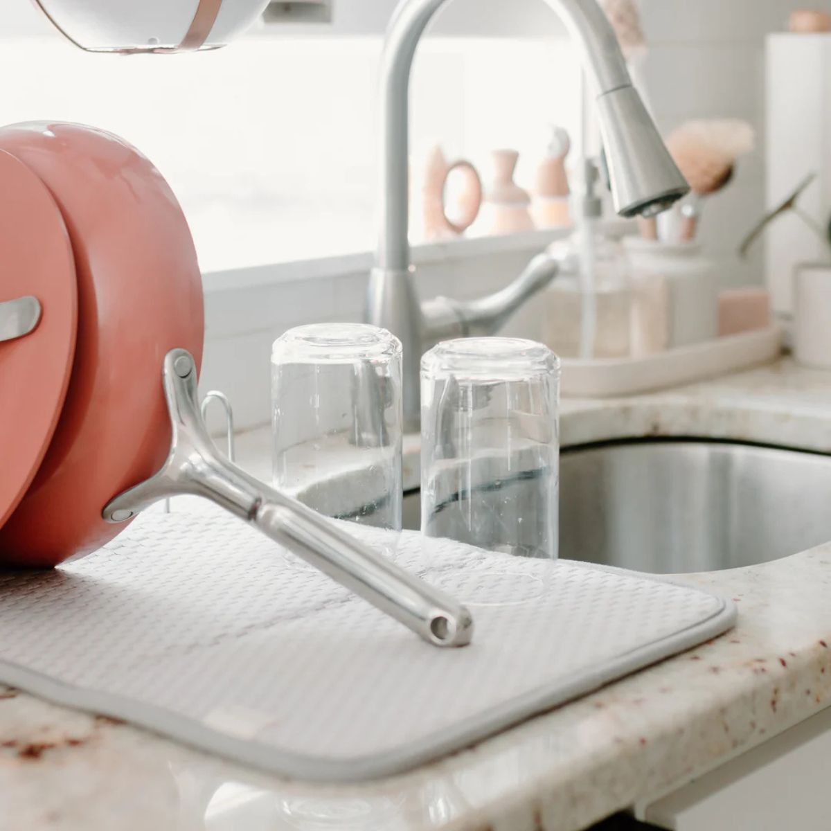 Avec le tapis égouttoir en microfibre recyclée Shape Shifter de Full Circle, fini le casse-tête pour savoir où poser la vaisselle une fois lavée. Oubliez les parties de Tetris improvisées qui finissent en verres cassés, assiettes fissurées et sueurs froides quand tout tombe. Grâce à ce tapis égouttoir, vous pourrez sécher votre vaisselle confortablement et en toute sécurité.