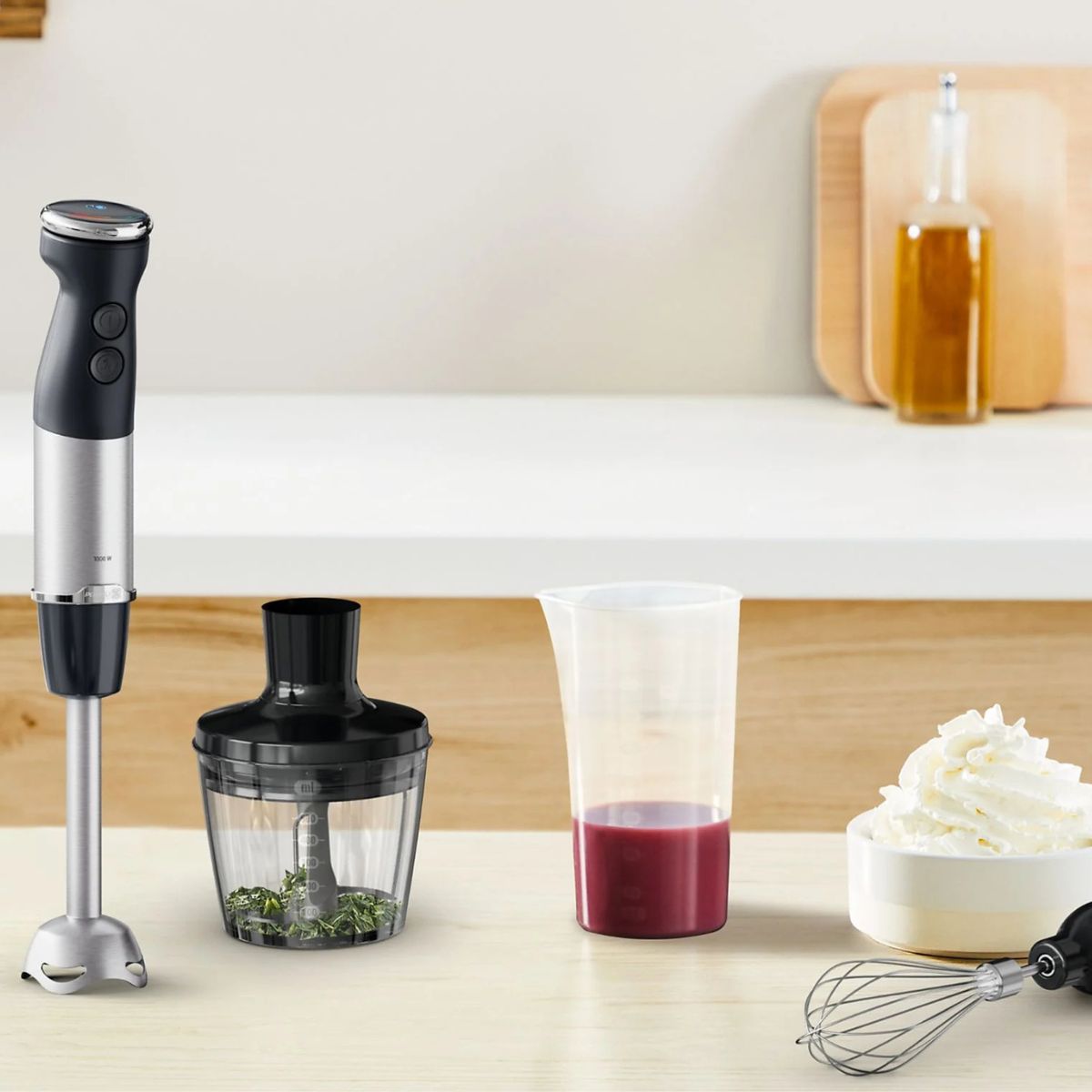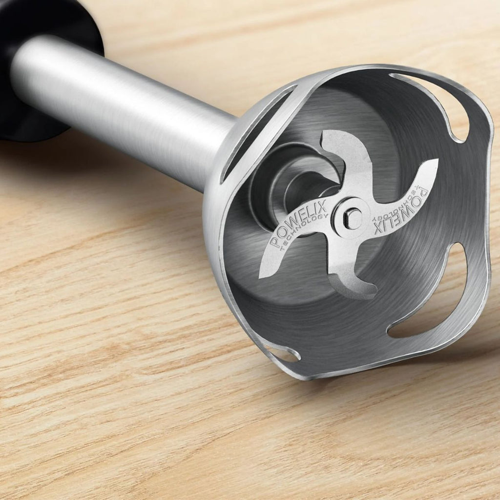 Le pack comprend le mixeur, un verre doseur de 800 ml de capacité, un hachoir de 500 ml, des fouets et un presse-purée. Tous ces accessoires sont compatibles avec le lave-vaisselle après utilisation. Les lames sont en acier et disposent de la technologie Powelix pour obtenir une texture et une onctuosité extraordinaires.