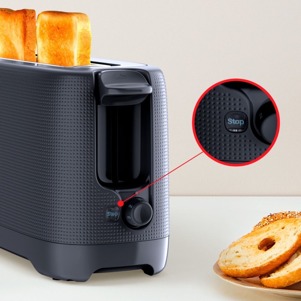 Si à un moment donné vous décidez d’arrêter le grillage, il vous suffira d’appuyer sur le bouton d’arrêt et de retirer les tranches confortablement. De plus, les miettes qui tombent pendant le grillage peuvent être facilement nettoyées en retirant le tiroir ramasse-miettes amovible.
