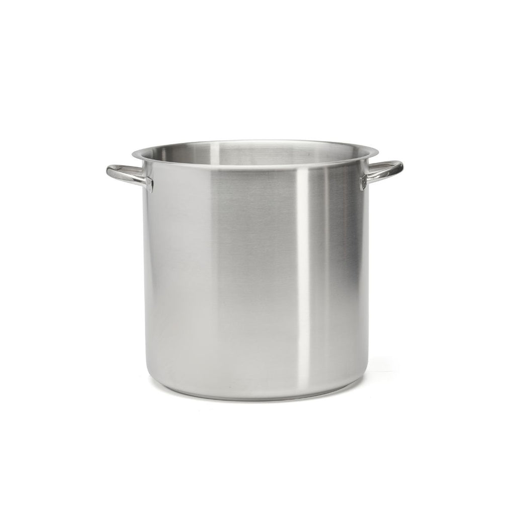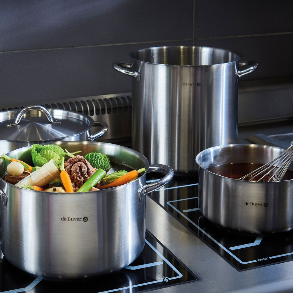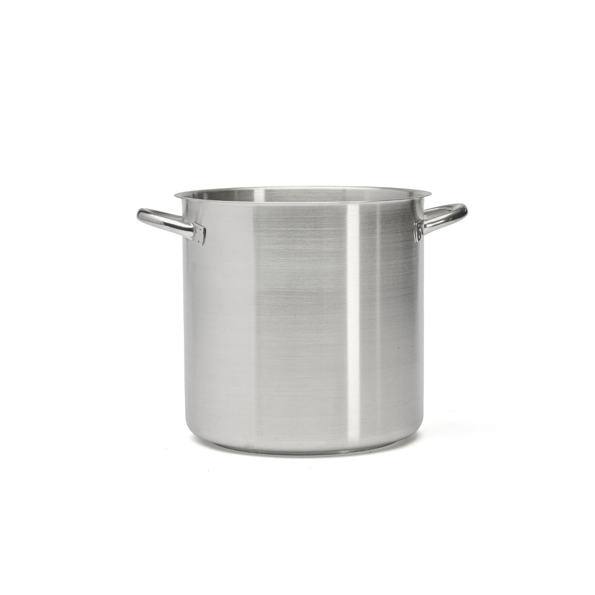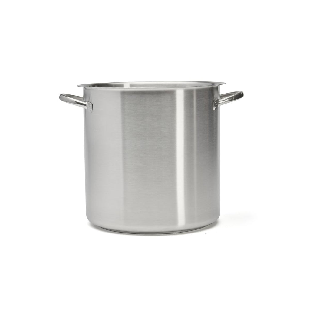 Olla alta de acero inoxidable 18/10 con acabado satinado y base difusora del calor, apta para todas las cocinas incluida la inducción.
