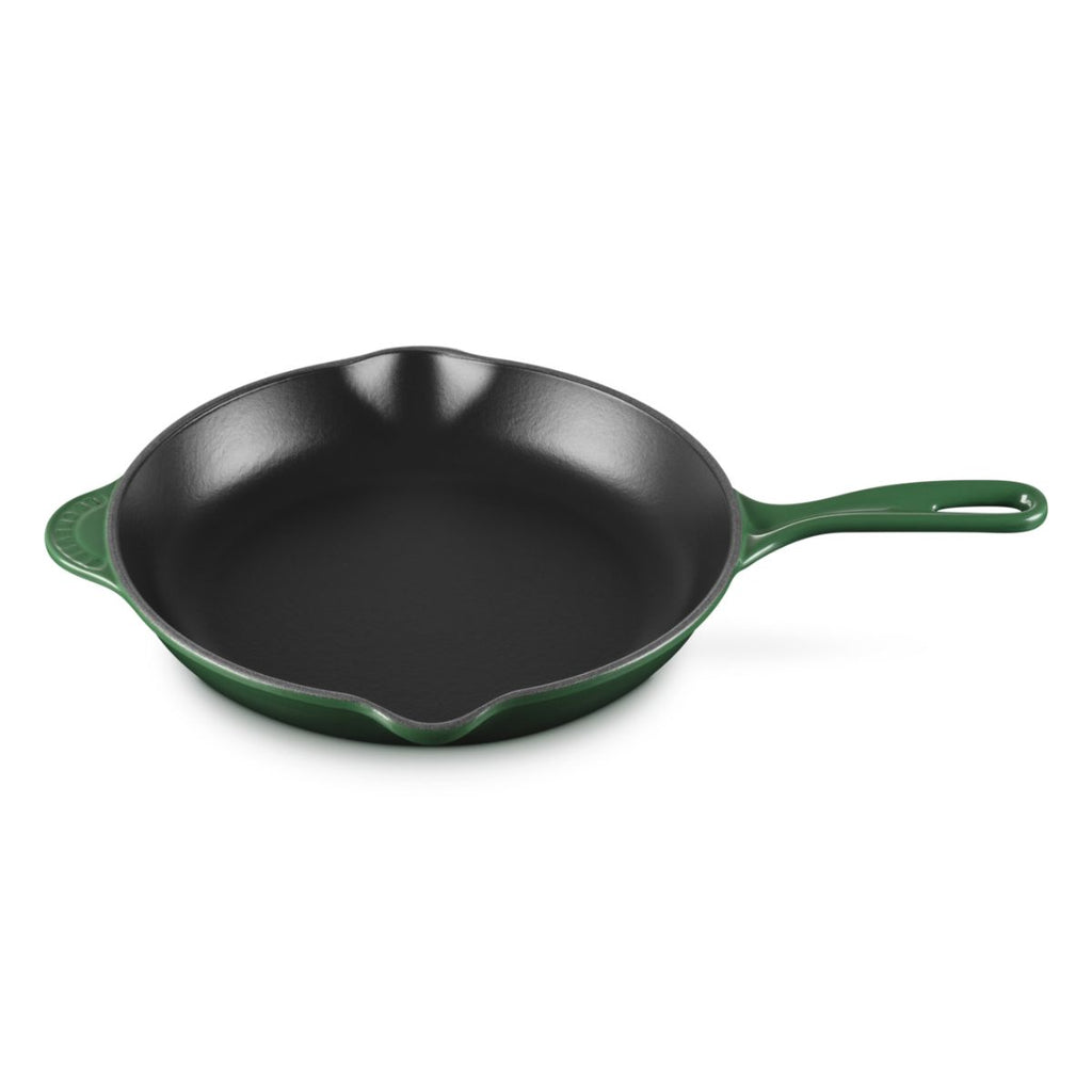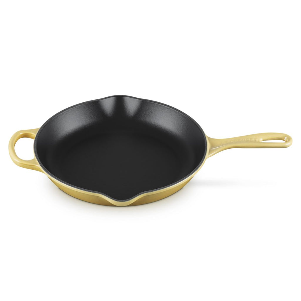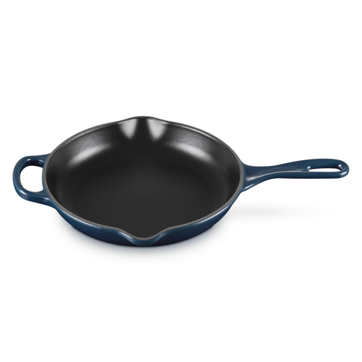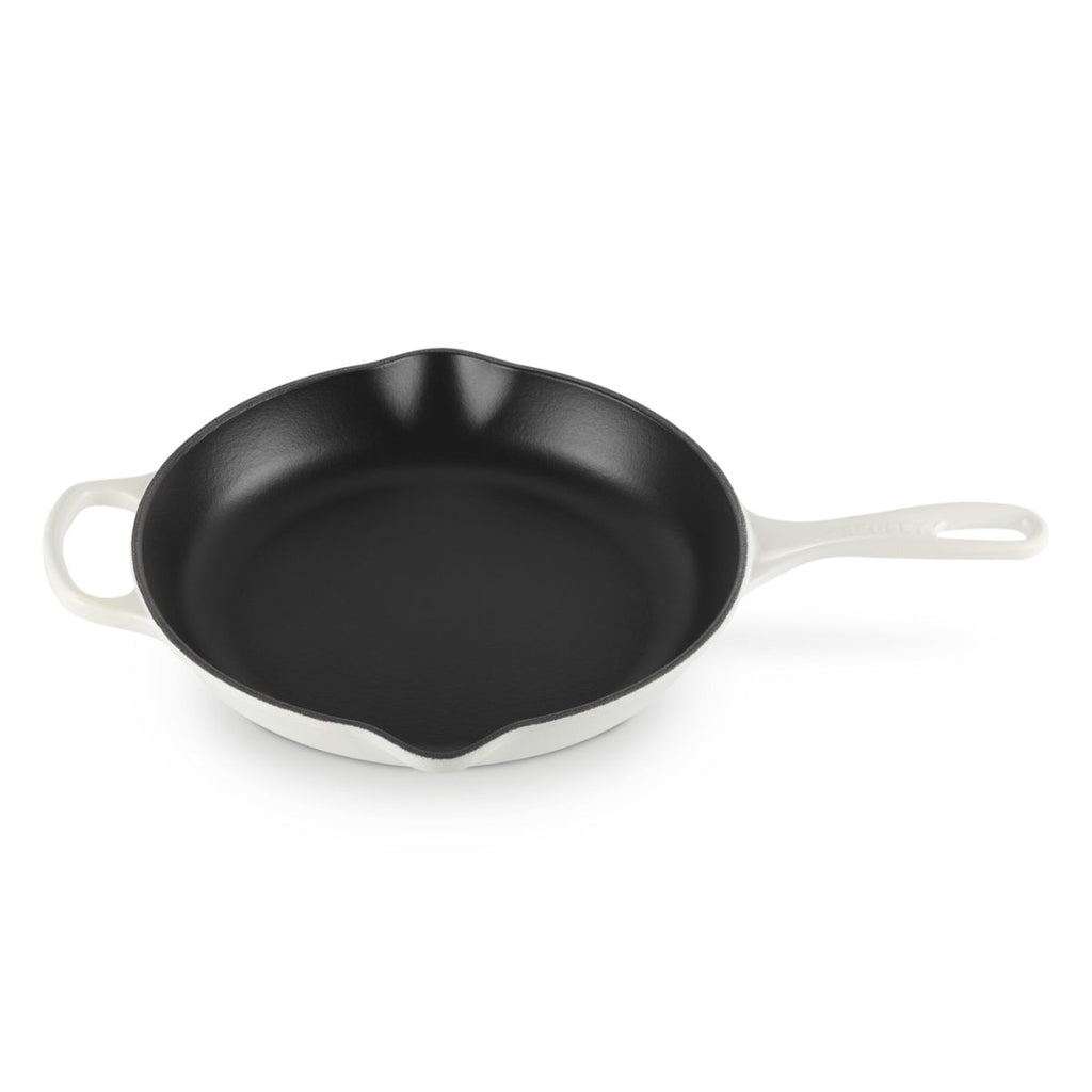 Une Skillet est une poêle à parois basses et légèrement inclinées vers l’extérieur. Tout simplement. Dans le cas des poêles Le Creuset, ce terme désigne généralement le modèle classique en fonte avec poignée intégrée, qu’elles soient lisses ou rainurées, rondes ou carrées.