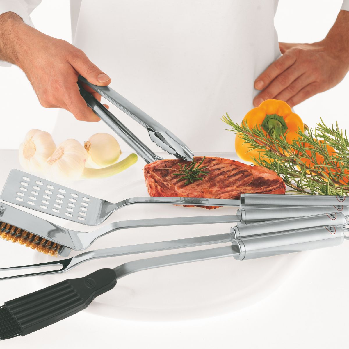 Ces pinces associent un design traditionnel au système de verrouillage innovant de Rösle. Elles se distinguent par leur solidité et durabilité, tout en étant sécurisées, faciles à utiliser et extrêmement fonctionnelles. Vous apprécierez leur maniabilité et leur capacité à saisir fermement les aliments. Les extrémités larges et incurvées permettent de saisir facilement une bonne quantité d'aliments, que ce soit pour les retourner dans la poêle ou pour les servir.