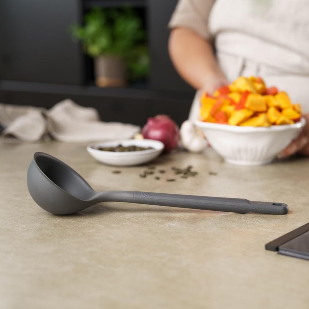 La louche en nylon Zyliss allie utilité et délicatesse : elle se sent légère en main mais performante. Cette louche offre un design pensé pour servir soupes, crèmes ou ragoûts sans effort et sans abîmer les casseroles avec revêtement antiadhésif.