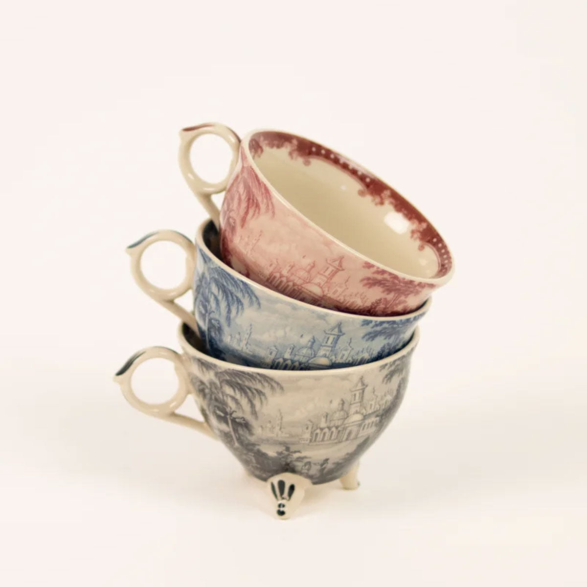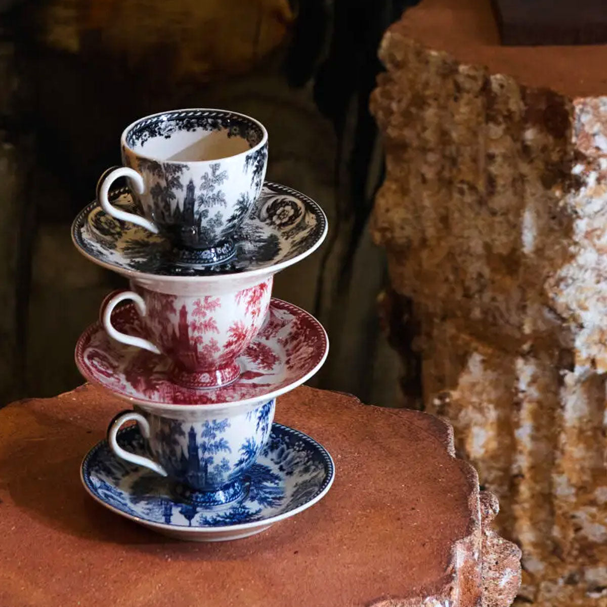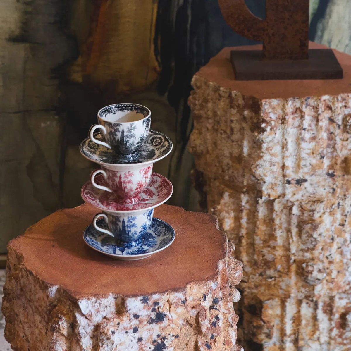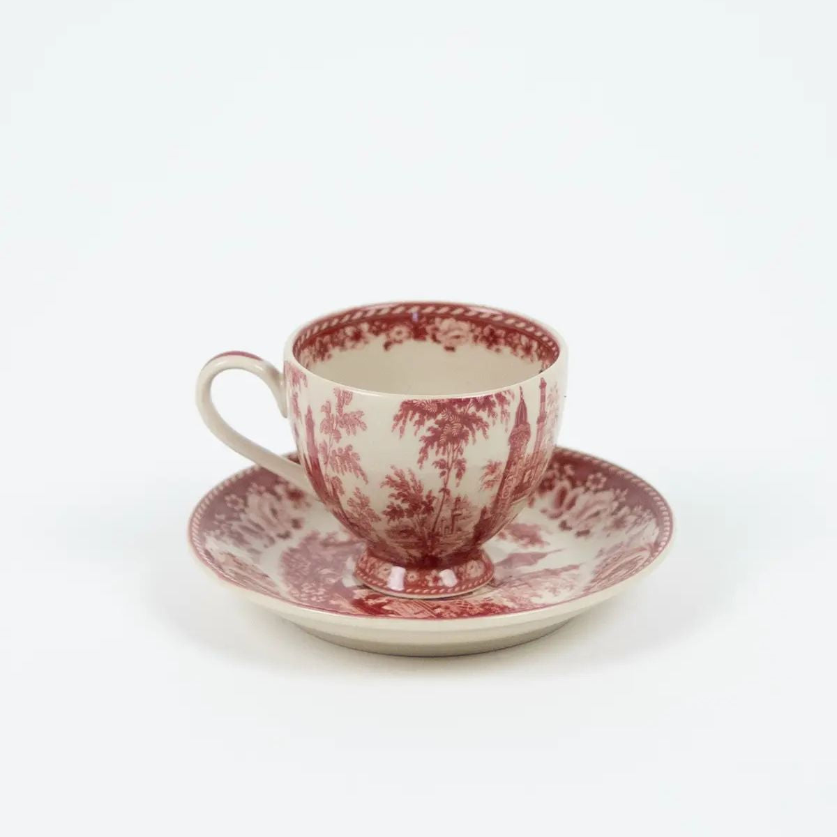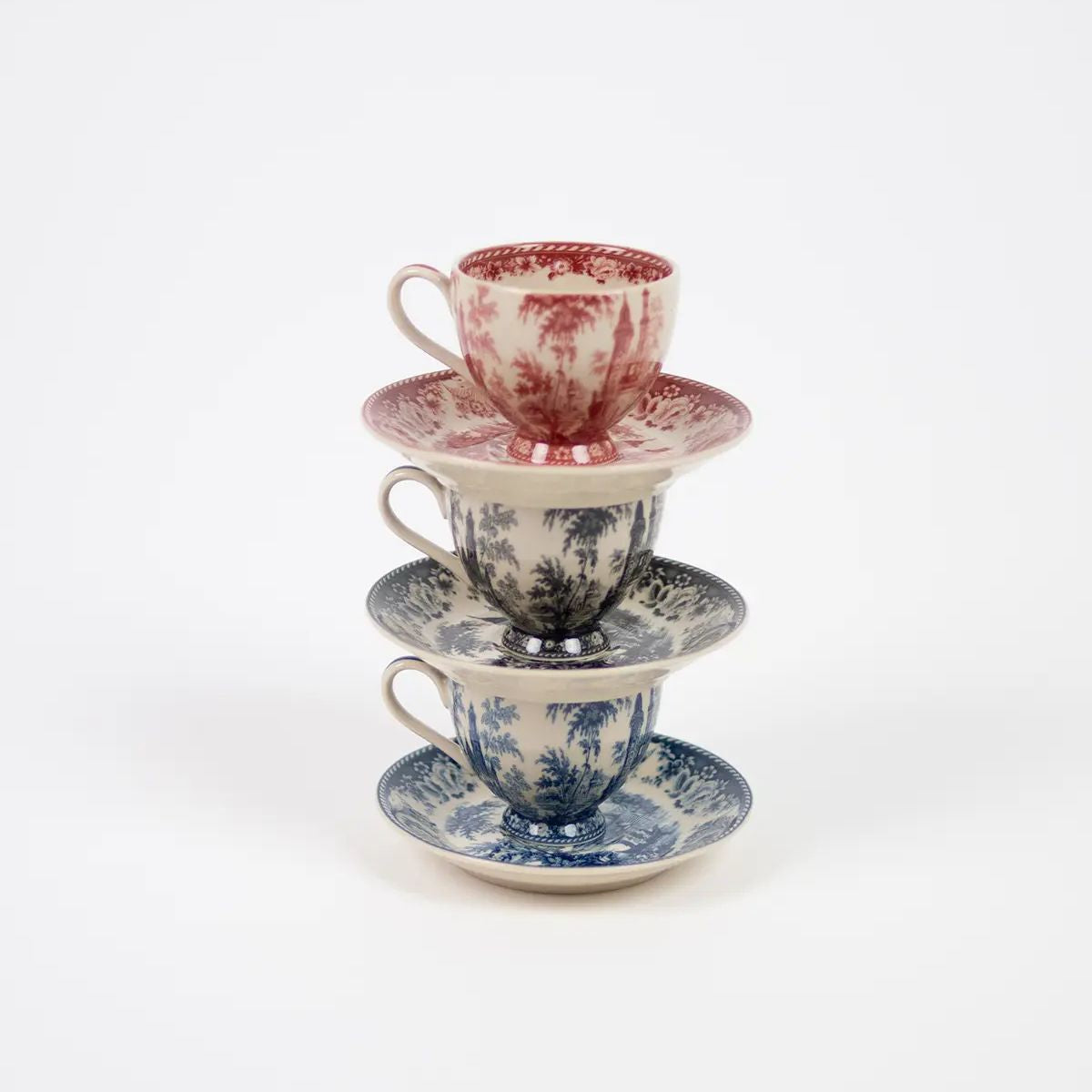La taza y el plato están diseñados con el clásico estilo Toile de Jouy. Su estampado muestra motivos románticos y paisajes detallados inspirados en la Francia del siglo XVIII, en una combinación perfecta de historia y sofisticación, con un toque moderno en su justa medida.