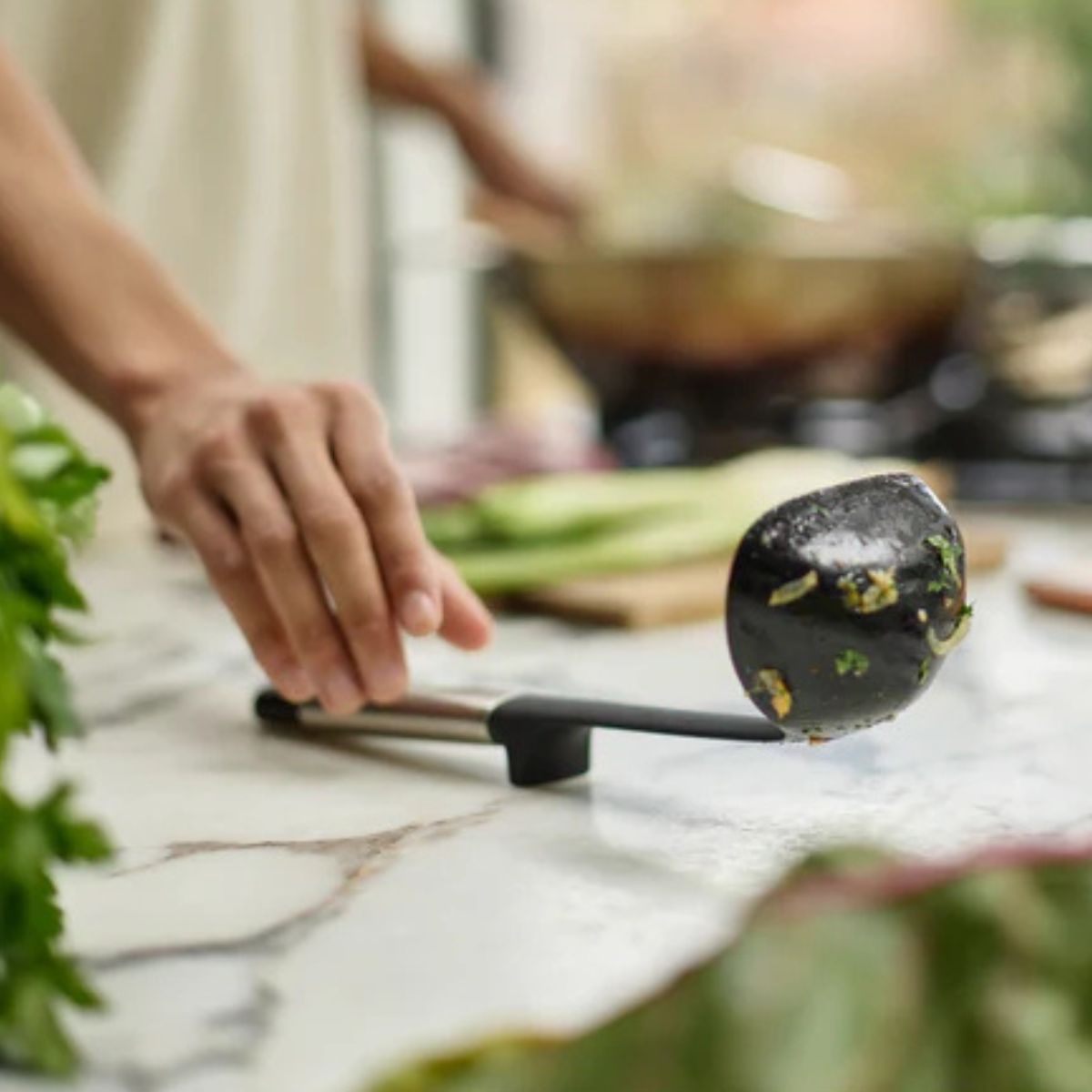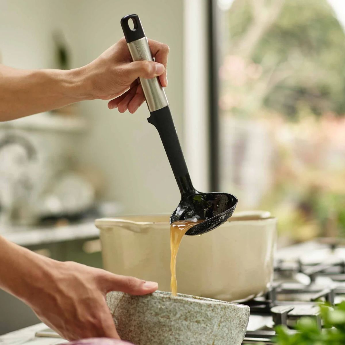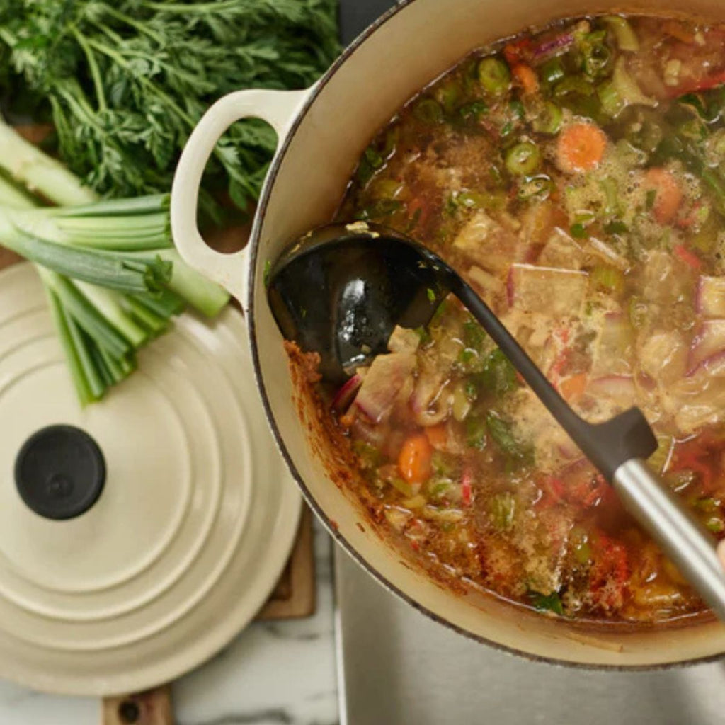 Inoltre, il suo cucchiaio in silicone è profondo e ha un bordo frontale piatto, perfetto per servire zuppe, stufati o salse, e per raccogliere fino all'ultimo cucchiaio dal fondo della pentola o padella. È realizzato in silicone resistente al calore fino a 210 ºC, quindi è sicuro da usare anche con utensili da cucina antiaderenti evitando graffi o danni.