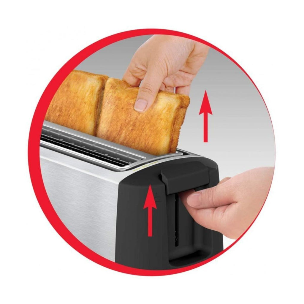 Le fessure di questo tostapane Subito Select Moulinex si distinguono per essere lunghe, permettendo così di tostare comodamente fette più grandi o anche di tostare due fette piccole contemporaneamente. Se ti preoccupa se sia semplice estrarre le fette piccole dall'interno, devi sapere che dispone di un sistema di sollevamento che facilita l'estrazione ed evita di scottarti le dita.