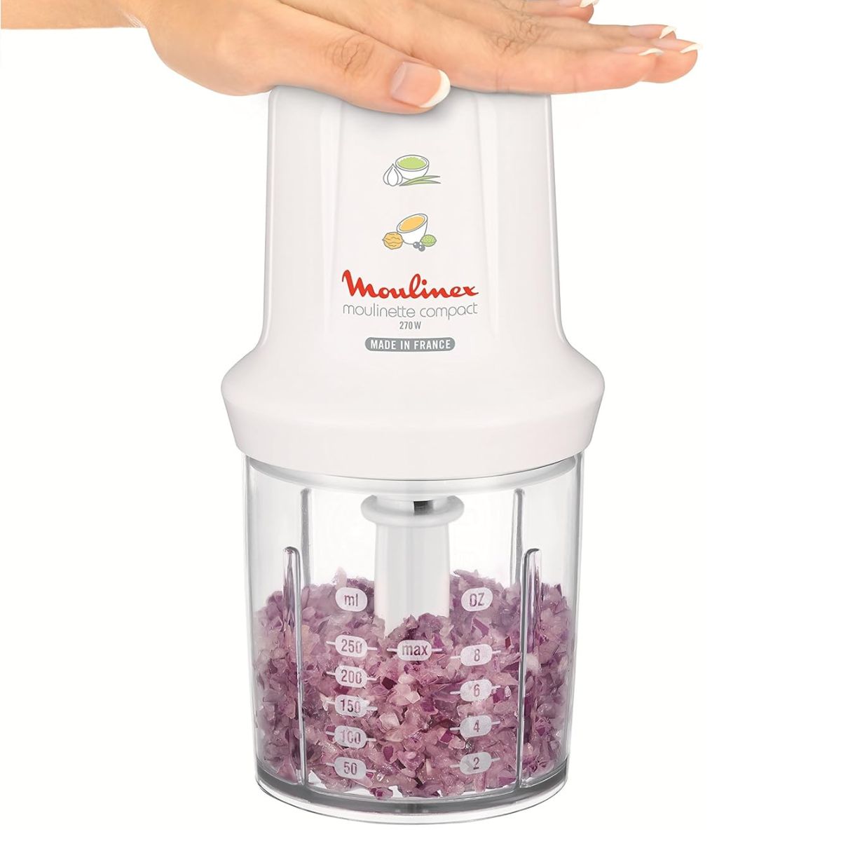 Il suo funzionamento non potrebbe essere più semplice: basta esercitare una leggera pressione sulla base e si avvia. In modo rapido riuscirai a tritare, tagliare e sminuzzare gli ingredienti con risultati eccellenti. Cosa aspetti a procurarti il tritatutto manuale Compact Moulinex?