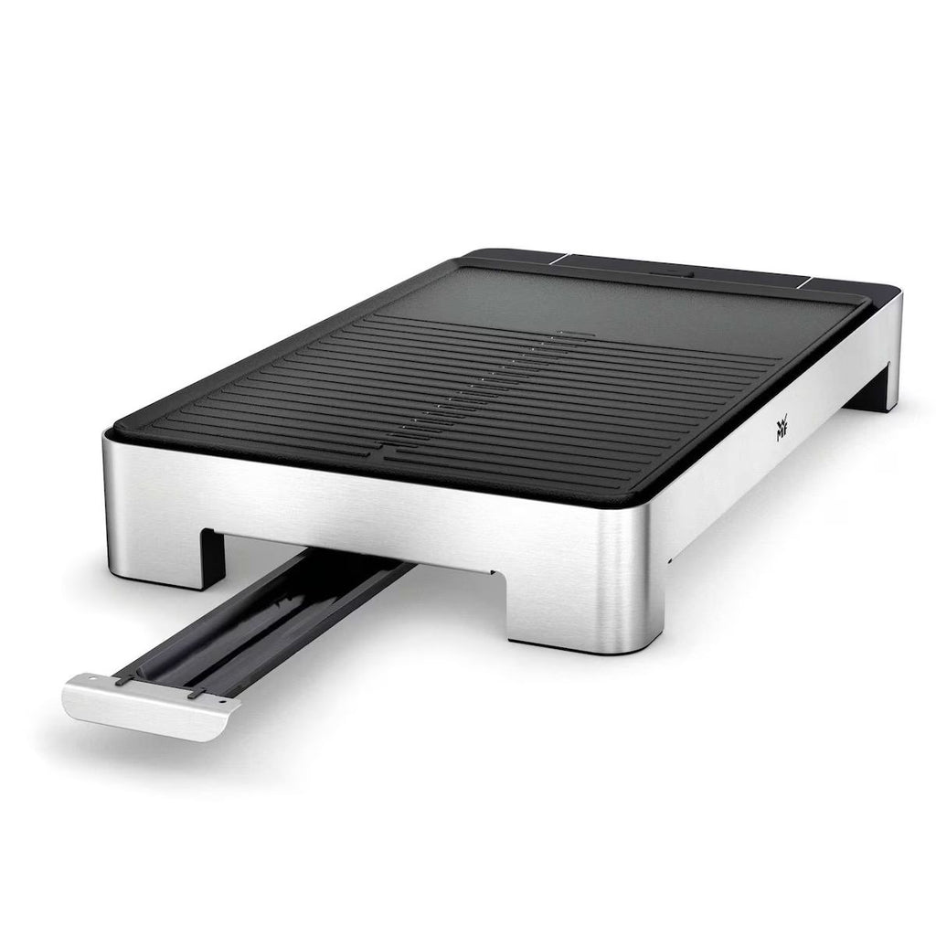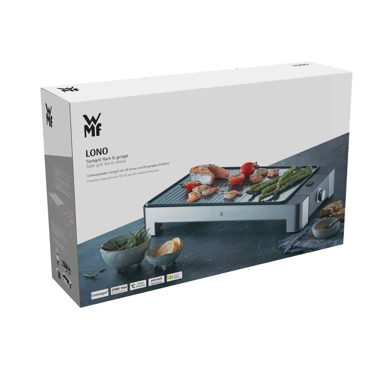 Se sei indeciso tra una piastra liscia e una griglia, il Grill e piastra liscia da tavolo Lono WMF è la risposta. Questo grill elettrico doppio è dotato di una ampia superficie di cottura antiaderente divisa in due sezioni: una liscia e una rigata tipo griglia. Puoi cucinare carne, pesce, verdure, uova o anche sandwich e panini, come preferisci, in modo semplice, comodo, salutare e senza accendere i fornelli!