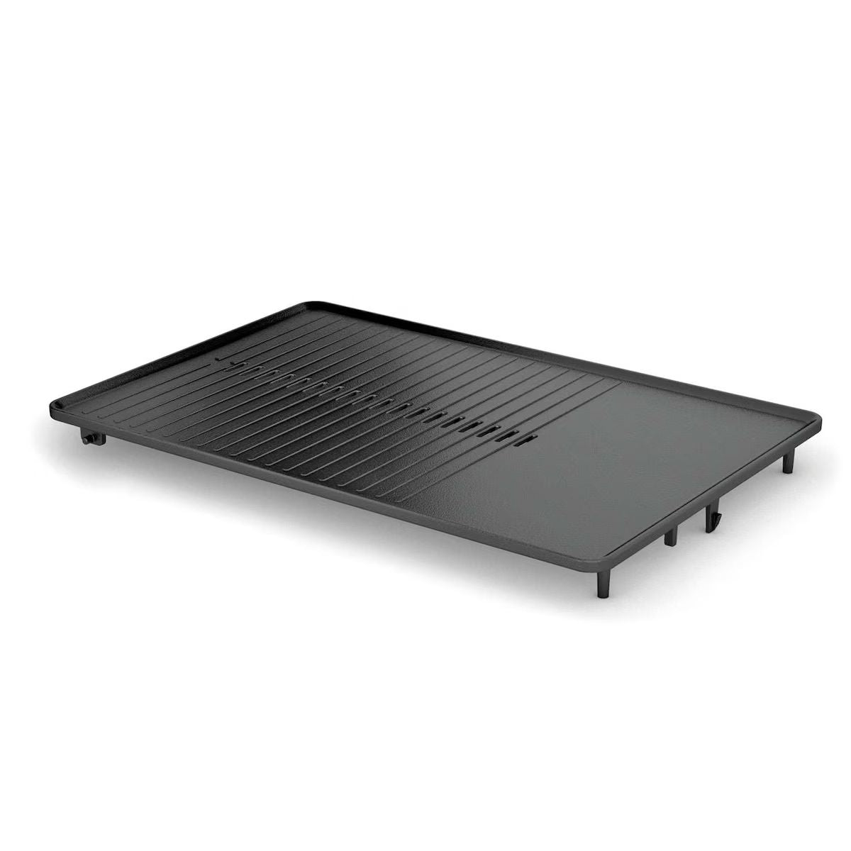 La sua piastra rettangolare offre un'ampia superficie di cottura di 41 x 27 cm, perfetta per sfruttare al massimo lo spazio grazie al design piatto. Ha il vantaggio di essere divisa in due sezioni: una liscia e una più grande con superficie grigliata, per cuocere al meglio ogni alimento. I fori centrali permettono al grasso di scolare nella vaschetta raccogli grassi, garantendo una cottura sana e un effetto di rosolatura e caramellizzazione eccellente.