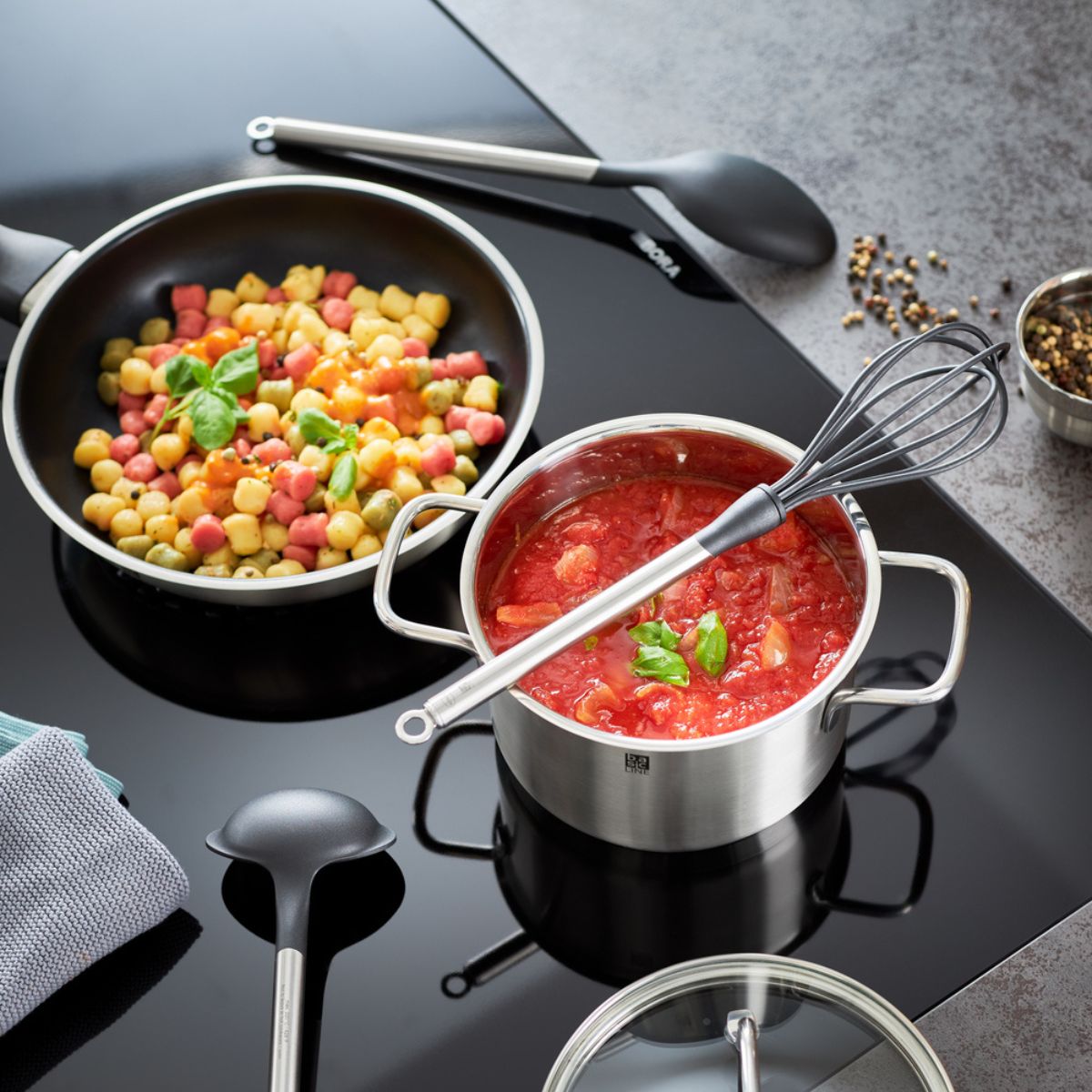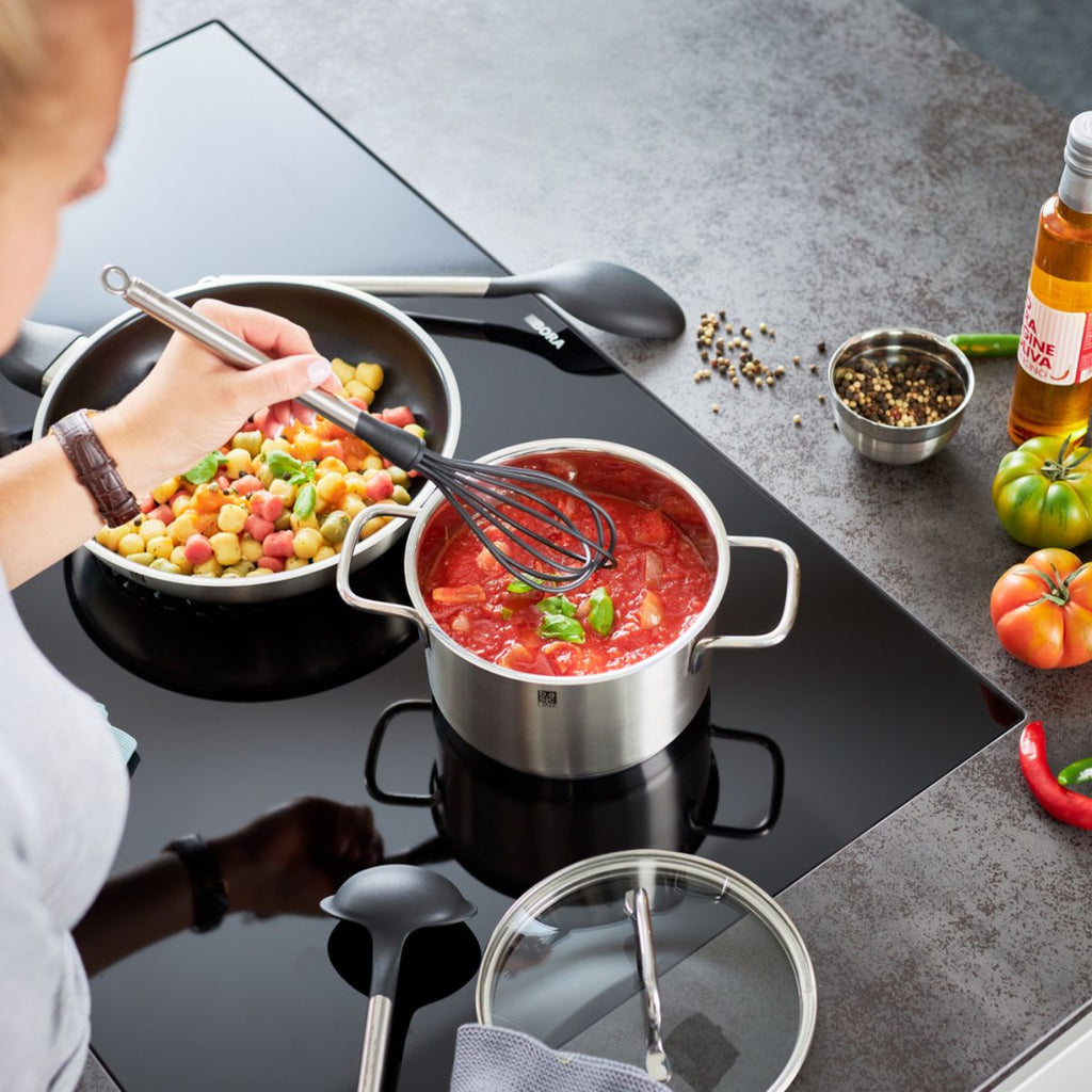 Con la Frusta in nylon con manico in acciaio inox Basic Line Rösle potrai montare, arieggiare, mescolare, amalgamare o legare salse in un attimo, in qualsiasi pentola, ciotola, casseruola, padella o stampo – anche antiaderenti o in ceramica, senza graffiarli o rovinarli! La userai nel modo più facile e comodo, proteggendo al tempo stesso i tuoi utensili da cucina grazie alle sue resistenti fruste in nylon. Vedrai com’è semplice sbianchire le uova, montare la panna o gli albumi, mescolare gli ingredienti di una crema o legare una salsa. Questa fantastica frusta è un aiuto prezioso in cucina!