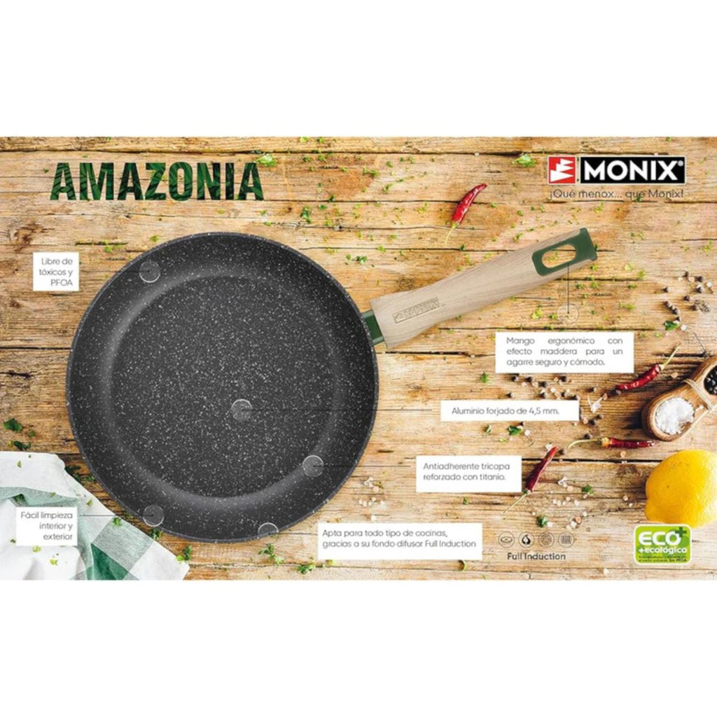 Con il set di 3 padelle antiaderenti Amazonia Monix scoprirai la perfetta fusione tra funzionalità e stile. Oltre a offrire prestazioni eccezionali in cucina, rappresentano anche l’impegno di Monix per la sostenibilità e il rispetto dell’ambiente. Realizzate con alluminio forgiato spesso alla base, garantiscono una distribuzione uniforme del calore e un’elevata efficienza. L’eccellente rivestimento antiaderente a triplo strato senza PFOA ti permetterà di cucinare in modo sano e comodo, poiché nulla si attacca.