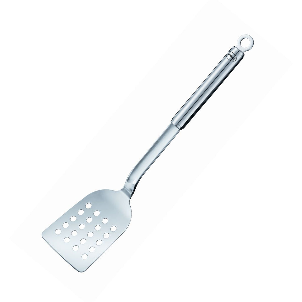 La spatola forata in acciaio inox con manico tondo Rösle è un grande aiuto in cucina. Questa elegante paletta forata è ampia e ideale per girare e sollevare comodamente tutti i tipi di alimenti, facendo sgocciolare l’olio o il liquido in eccesso di cottura grazie ai suoi fori. Vedrai quanto è comoda per togliere la carne dalla griglia, servire le fette di pesce o girare i pancake, perché i bordi arrotondati della pala rendono il lavoro più facile e allo stesso tempo rispettano gli alimenti.