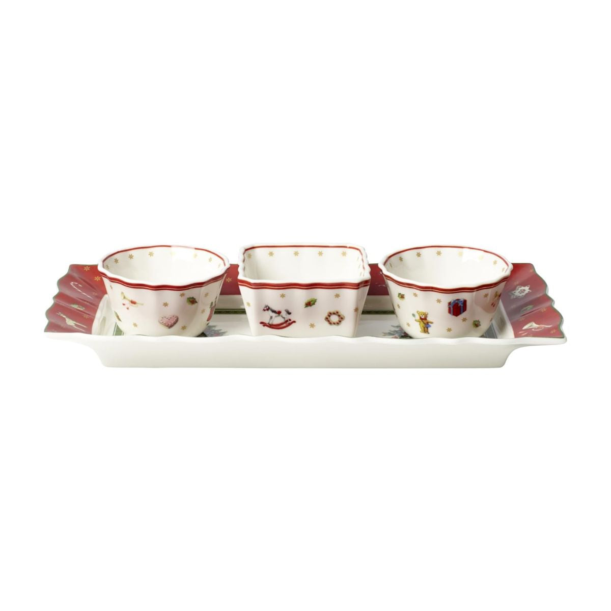 Este Conjunto de 4 piezas de porcelana para salsas y aperitivos Toy's Delight Villeroy & Boch, ¡no puede ser más bonito! Tan elegante como funcional, este juego incluye tres cuencos y una bandeja formando un set perfecto que lucirá precioso en tu mesa y usarás para todo. Fabricadas en Europa, con un precioso diseño y sus encantadores motivos navideños inspirados en juguetes clásicos, estas 4 piezas de porcelana prémium de gran durabilidad, llevarán la magia de la Navidad allí donde las coloques.