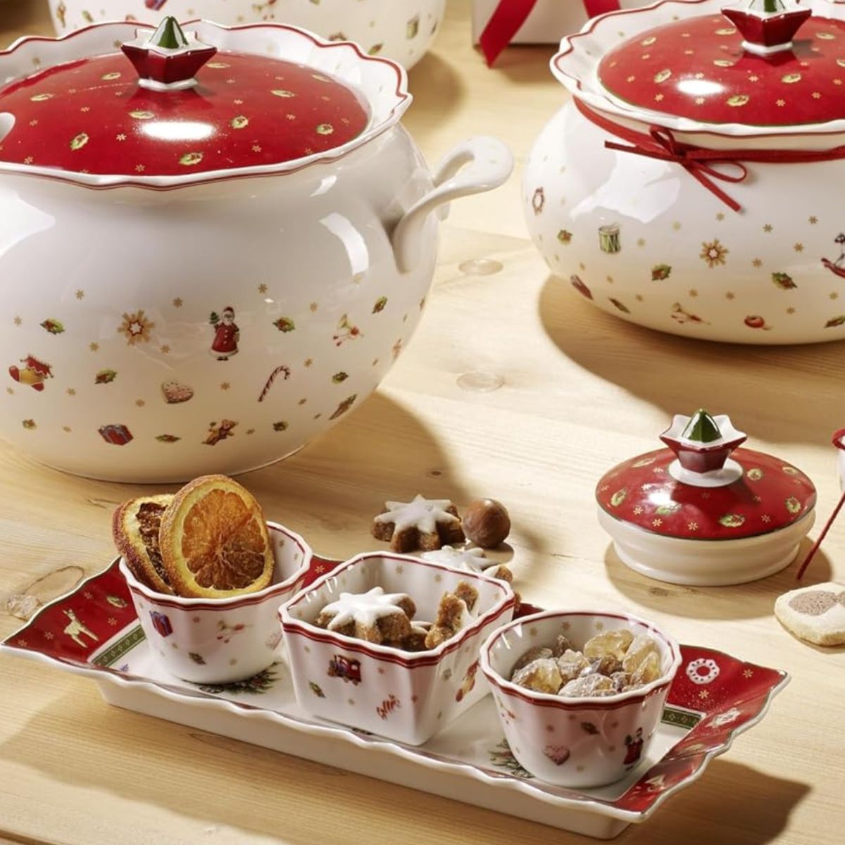 Trenes y caballos de madera, figuras de Papa Noel y del Cascanueces, hojas de acebo, cajas de regalo, árboles de Navidad o calcetines navideños sobre fondo blanco o rojo, decoran con maestría todas las piezas de la colección de forma elegante y delicada, evocando el encanto de las Navidades para cautivar todas las miradas en la mesa.